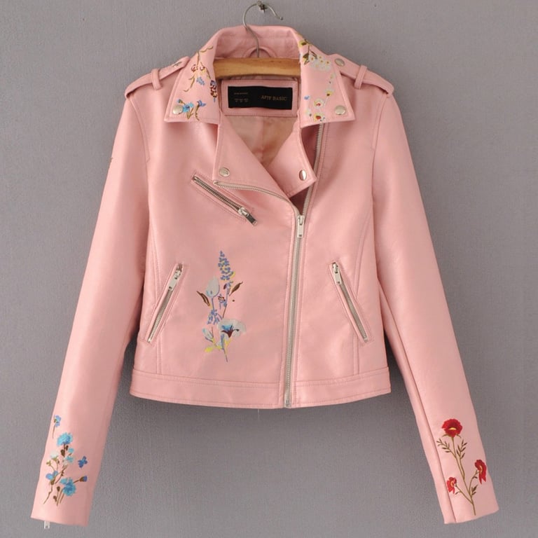 Women's faux leather jacket with floral pattern - Salmon