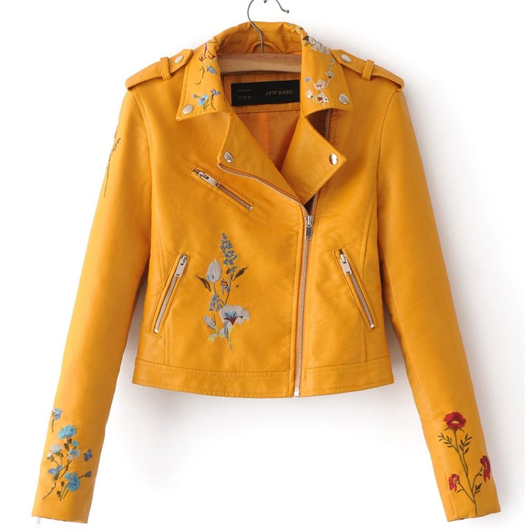 Women's faux leather jacket with floral pattern - Yellow