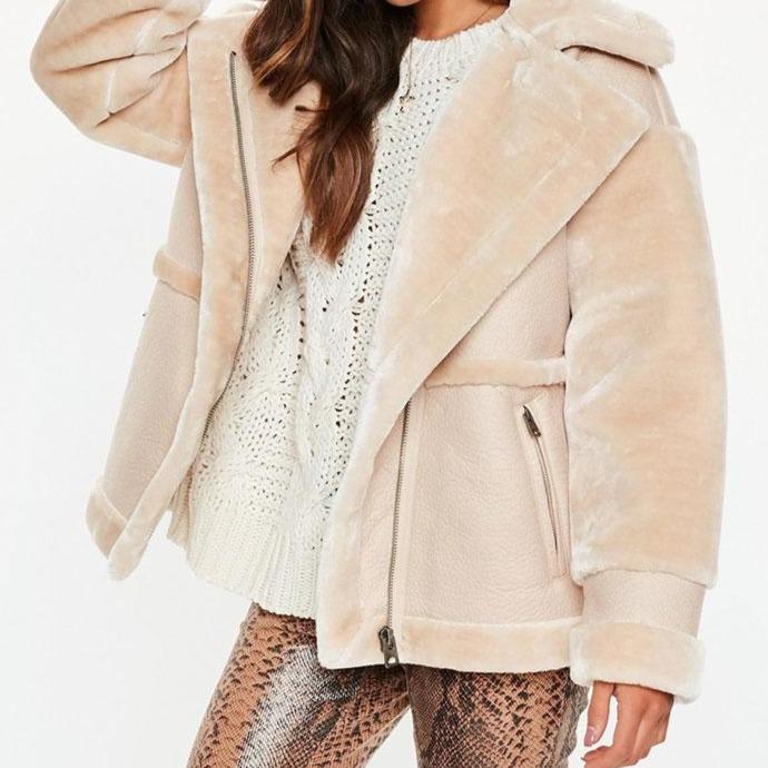 Stylish women's faux leather jacket with fluffy details. It is very comfortable and warm. We offer it in two beautiful, soft colours.