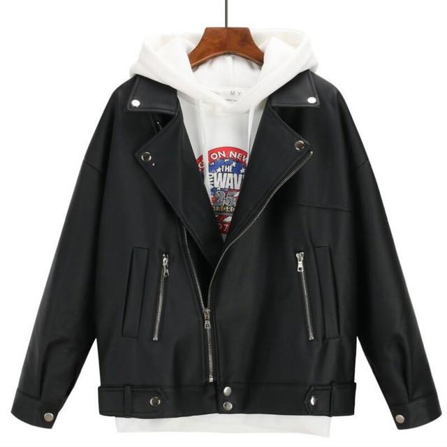 Women's wider faux leather jacket with pockets and zip fastening. Without a hooded sweatshirt. The jacket has a quilted lining.