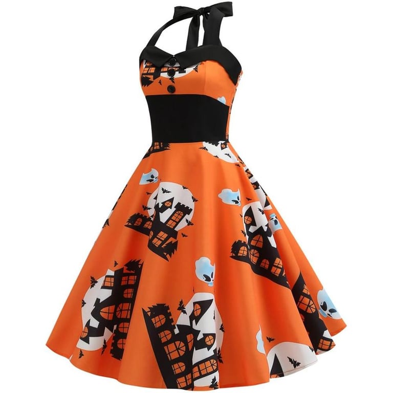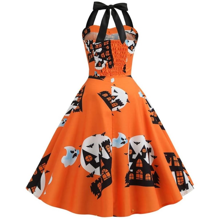 Women's festive A-line dress with straps and Halloween motif.