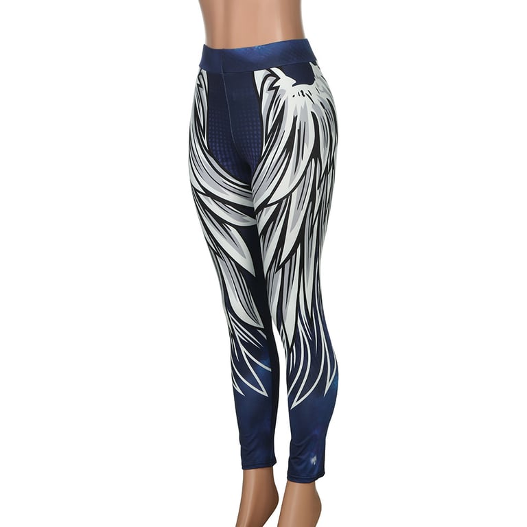 Flowing leggings with angel wing motifs. The leggings are black with white prints. Suitable for yoga and other sports activities.