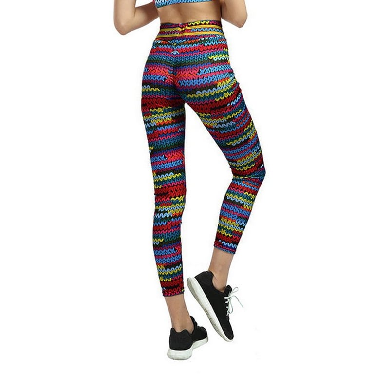 Colourful fitness leggings with a print resembling a knitted pattern. The leggings beautifully shape the figure.