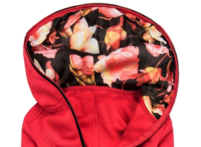 The hoodie features a large comfortable hood with a beautiful floral pattern.