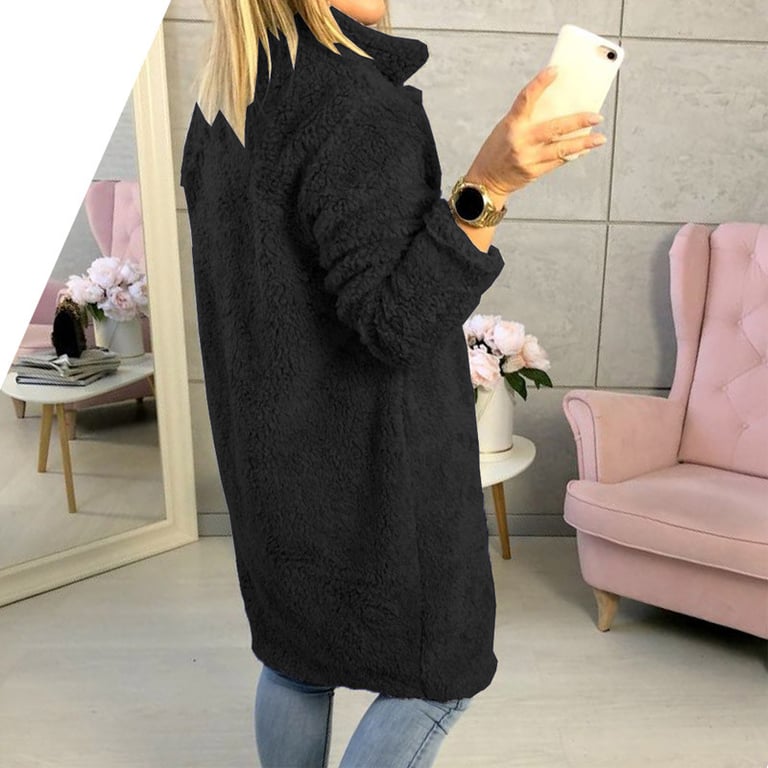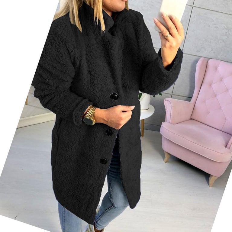 Stylish lightweight women's coat resembling fur. The coat features a large button fastening and a collar at the neck. Available in several colours.