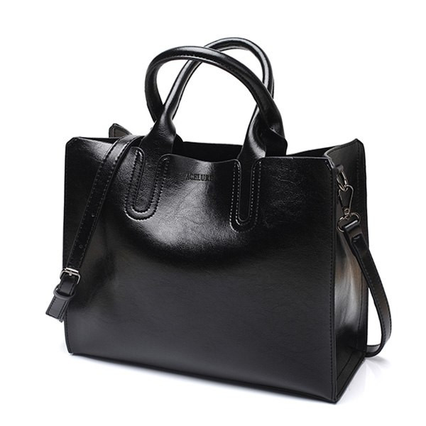 Large women's handbag with a leather-like appearance, featuring a short handle for hand carrying and a long detachable shoulder strap. The handbag has a zip closure and three inner pockets. Available in several colours.