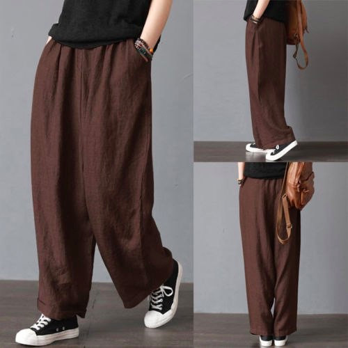 Women's harem trousers with wide legs. The trousers feature two side pockets and an elasticated waistband. Available in multiple colour options.