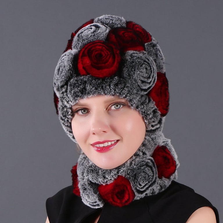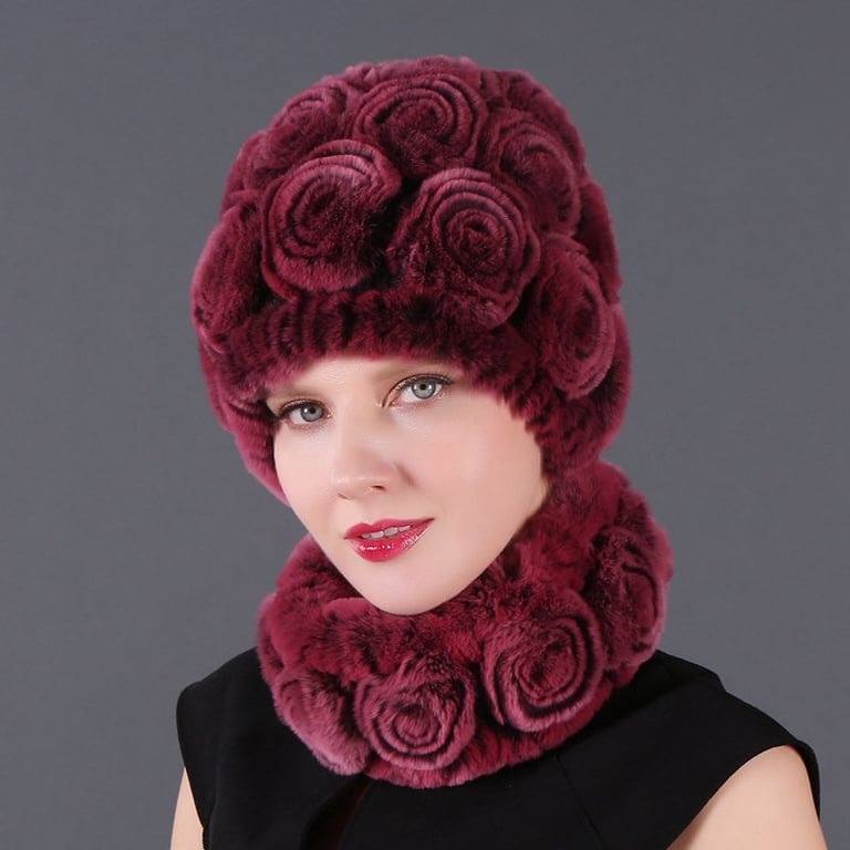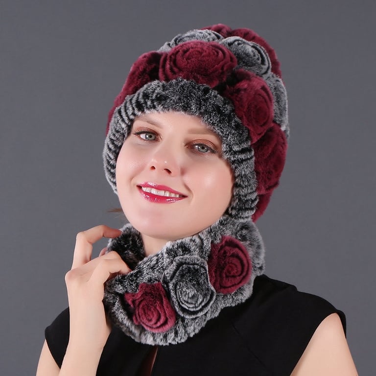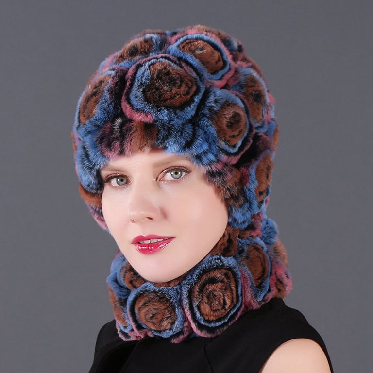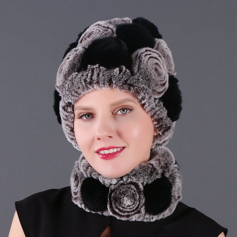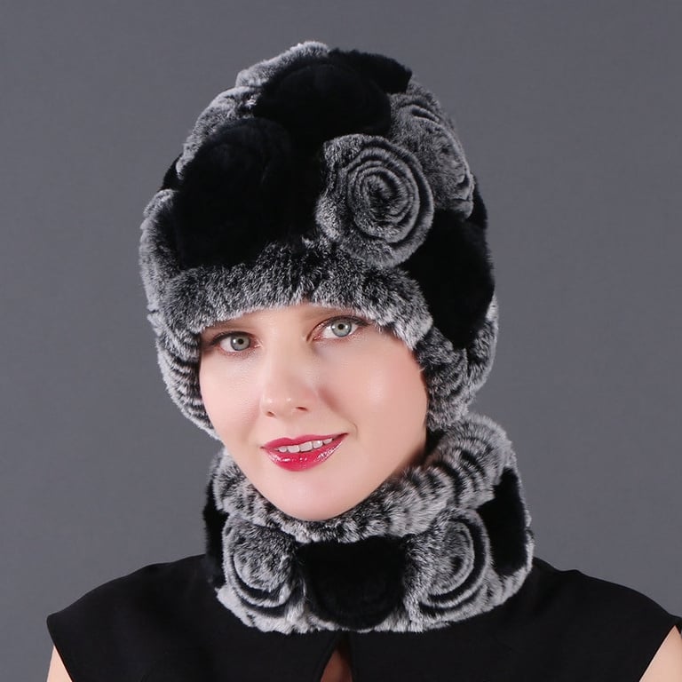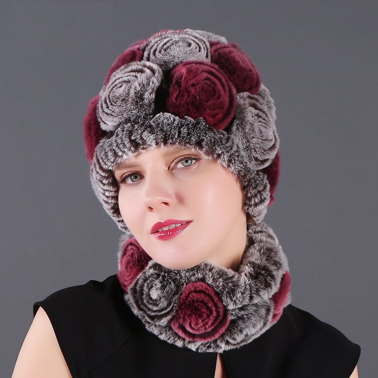 Luxurious women's fur hat with a matching scarf in the same colour scheme.