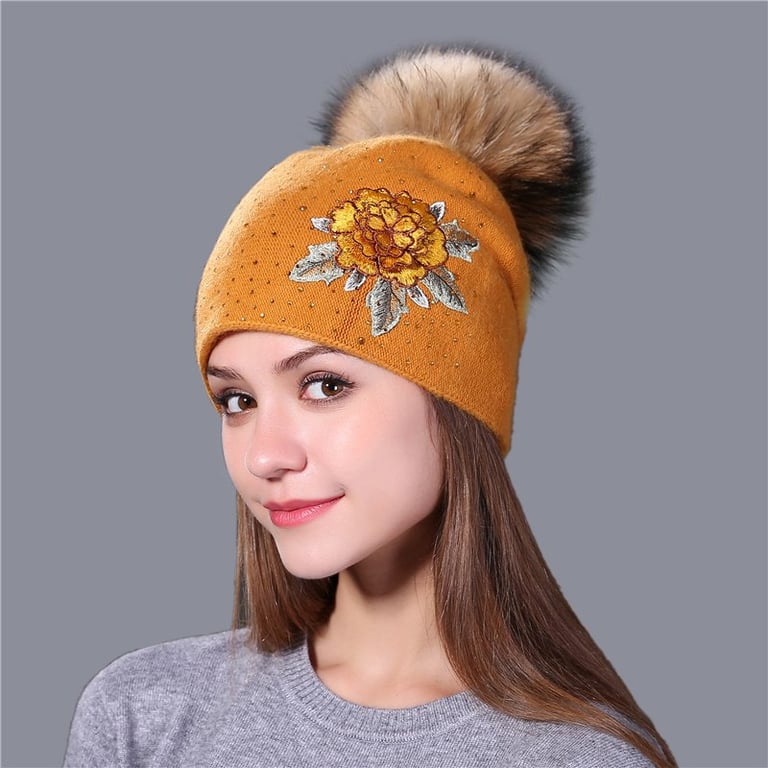 Women's winter hat with a large fluffy pom-pom. The hat features a flower patch on the front and is adorned with sparkling stones. Available in several colours.