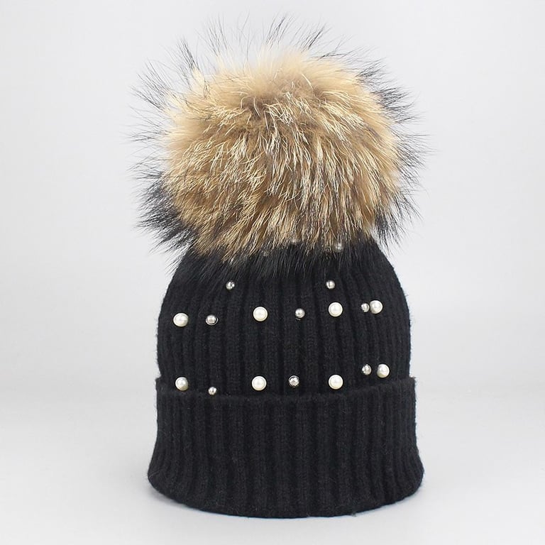 Women's knitted hat decorated with pearls and featuring a large fluffy detachable pom-pom. Available in various colour options.