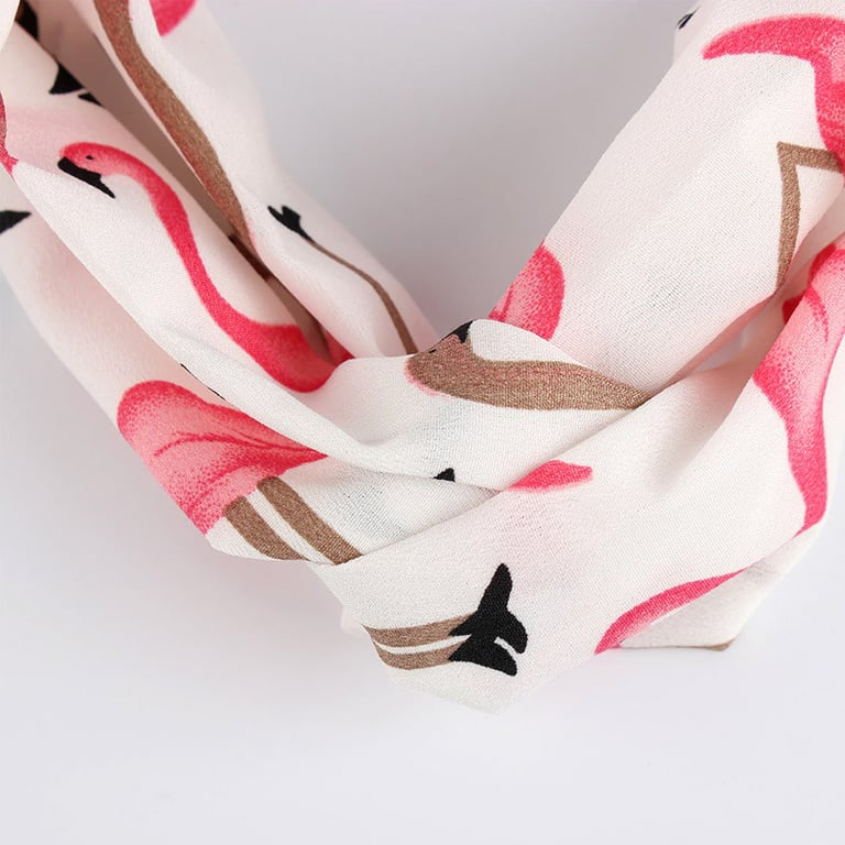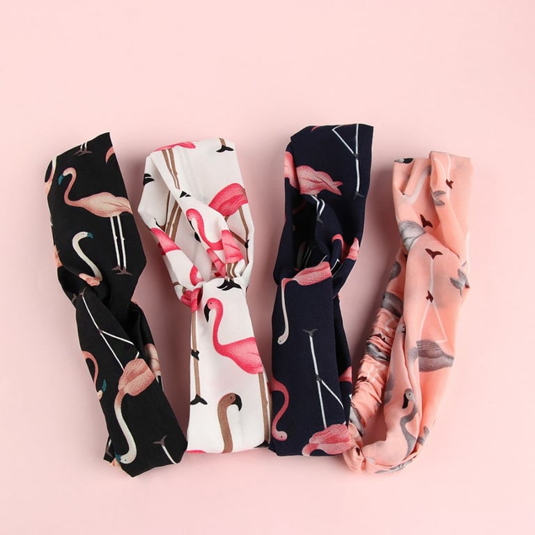 Women's hairband with a colourful print featuring flamingos and a decorative knot on the front. Available in multiple colours.