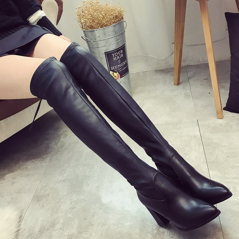 Women's winter high knee boots. The shoes have a leather-like appearance, a high heel of 8 cm, and a decorative bow at the back.