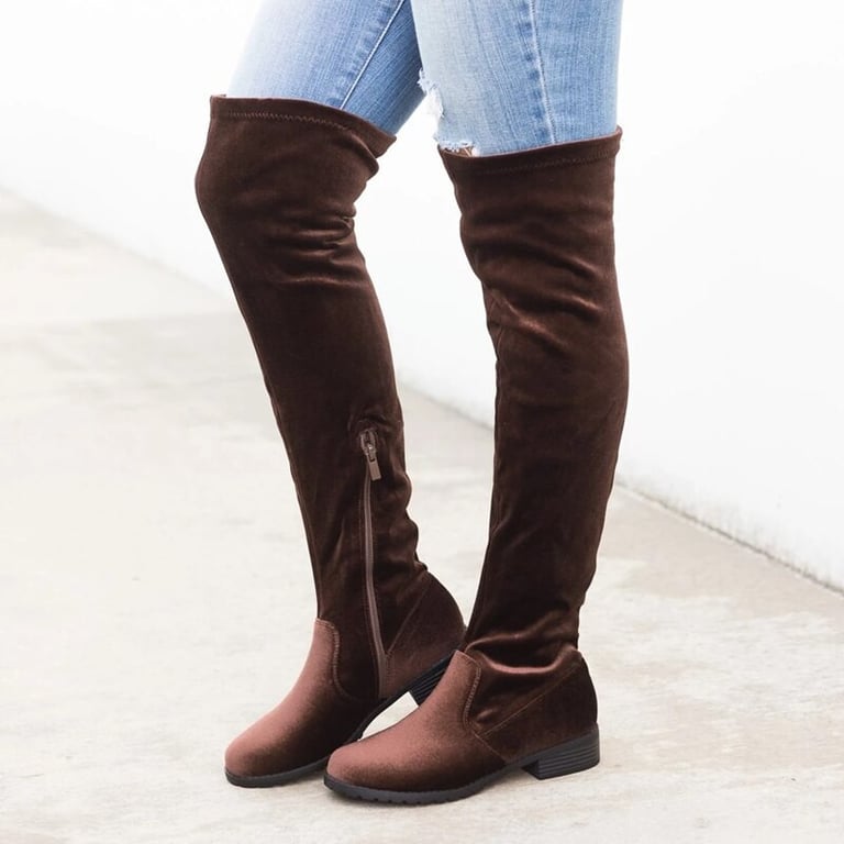 Women's high knee boots. The shoes feature a zip fastening on the inner side, a low heel, and a flat sole. Suede look. Available in multiple colour options.