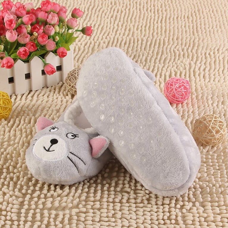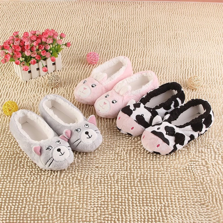 You will love these comfortable home slippers featuring a cat, cow, and rabbit design.