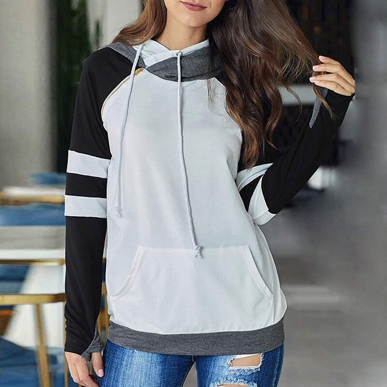 Women's pullover hoodie. Loose fit with a hood and kangaroo pocket. Asymmetrical zip fastening. Long sleeves with striped detail. Available in multiple colour options.