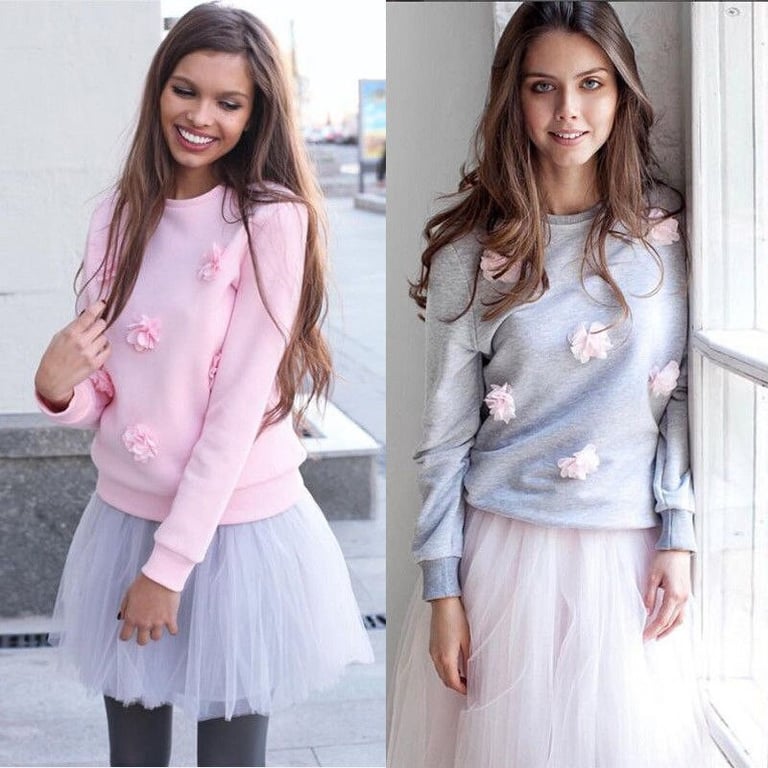 Women's cute pink sweatshirt with long sleeves and a round neckline. The front of the sweatshirt is decorated with sewn-on flowers.