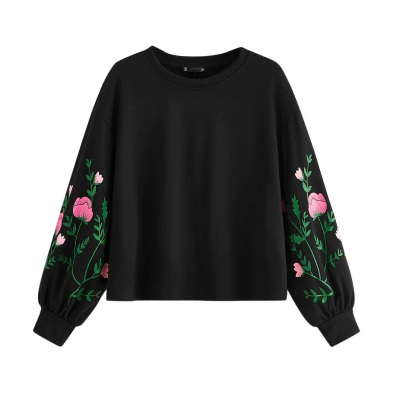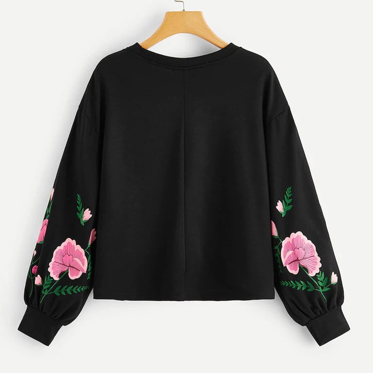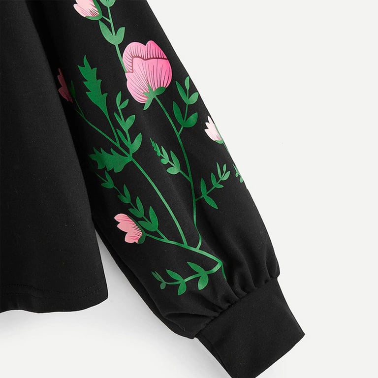 Women's pullover hoodie. Loose fit with a round neckline. Long sleeves with a floral pattern. Available in multiple colour options.