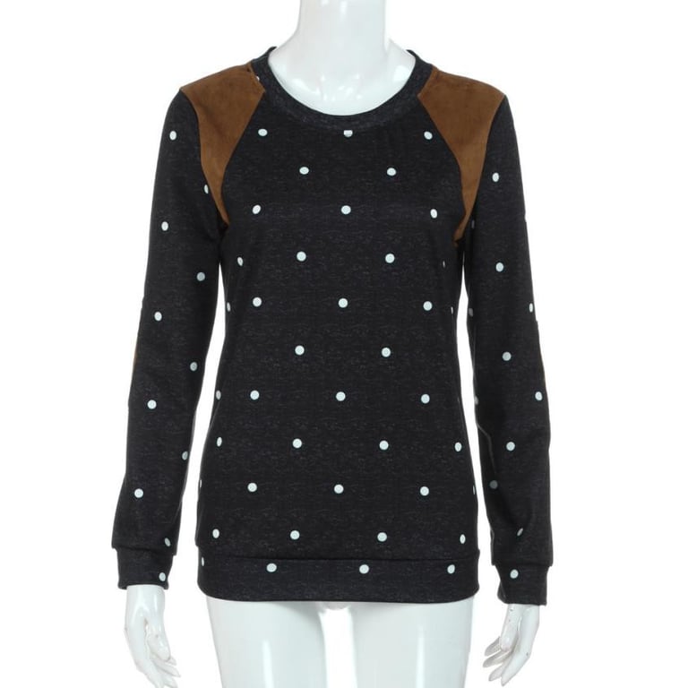 Women's sweatshirt with a polka dot pattern. The sweatshirt is adorned with embroidery on the shoulders and elbows. Available in three colour options.