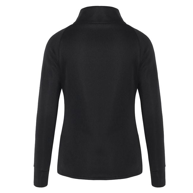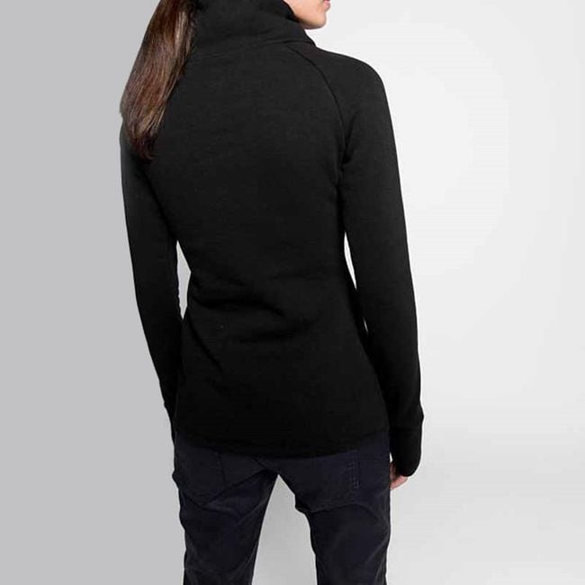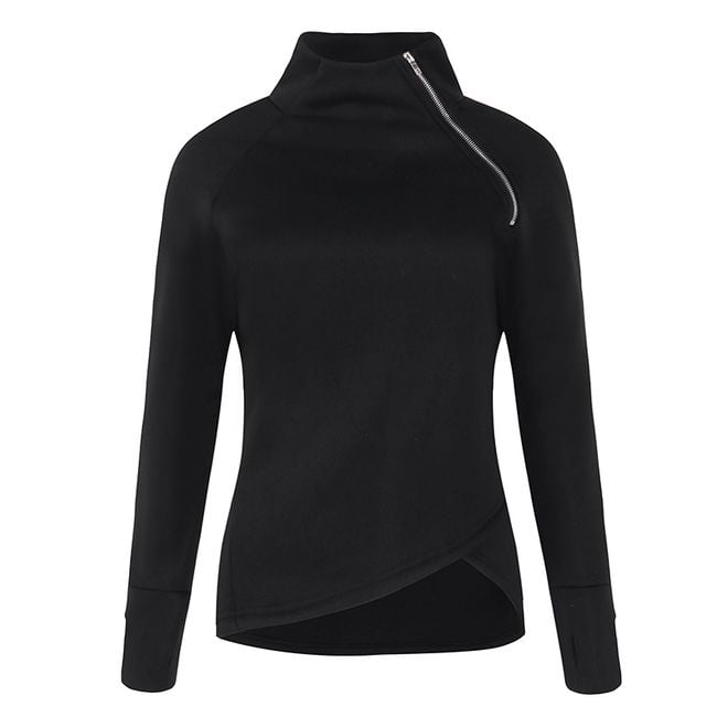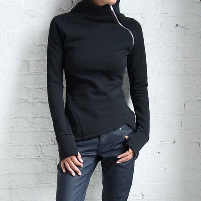 Stylish hoodie with asymmetrical neck fastening features long sleeves with thumb holes.