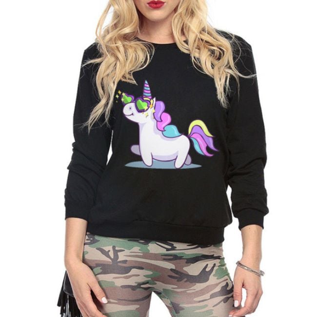 The sweatshirt is black, features a very stylish print with a unicorn, and is suitable for both school and work.
