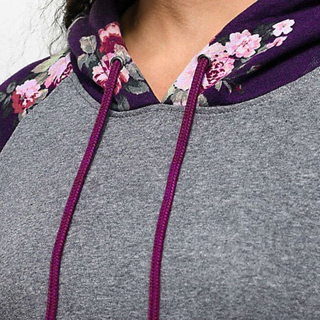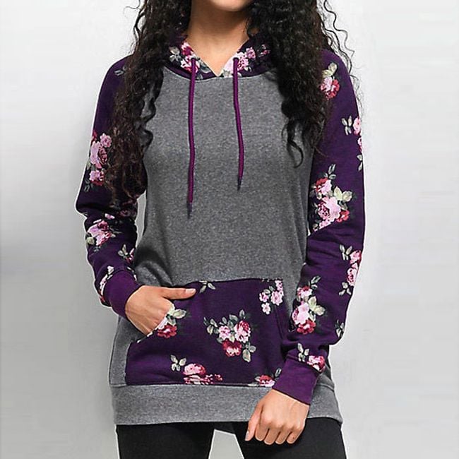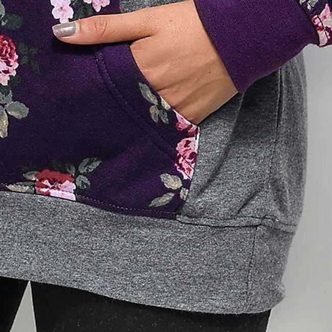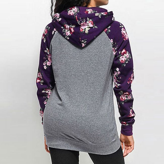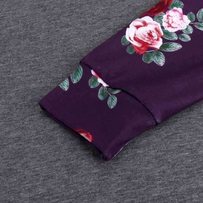 The sweatshirt has a beautiful purple-grey colour that goes great together. Additionally, there is a stylish print with roses on the sleeves, hood, and kangaroo pocket. The sweatshirt is very stylish and suitable for many occasions.