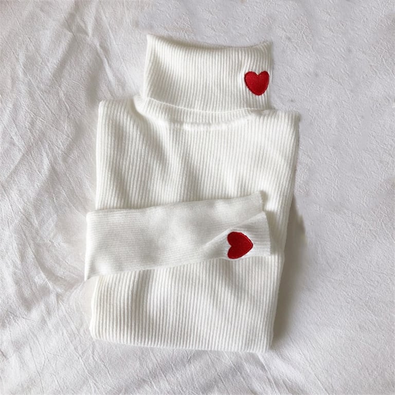 A cute sweater featuring a small embroidered heart on the sleeve and neck.