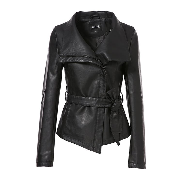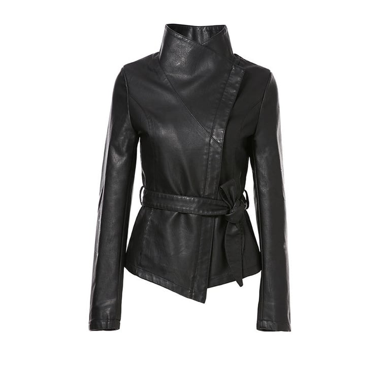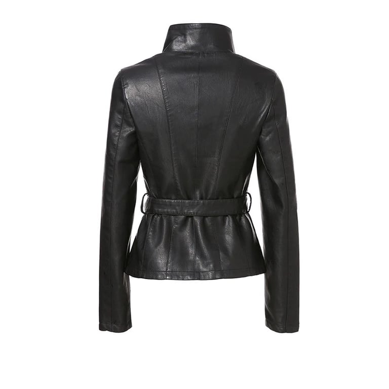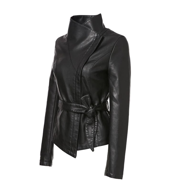 Women's short faux leather jacket with a zip fastening and a tie at the waist. The jacket features a collar that can be worn either open or closed. Available in several colour options.