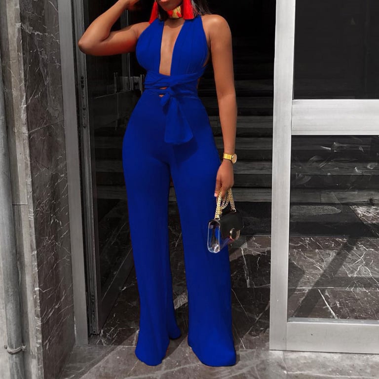 Women's jumpsuit with a deep neckline and tie detail.