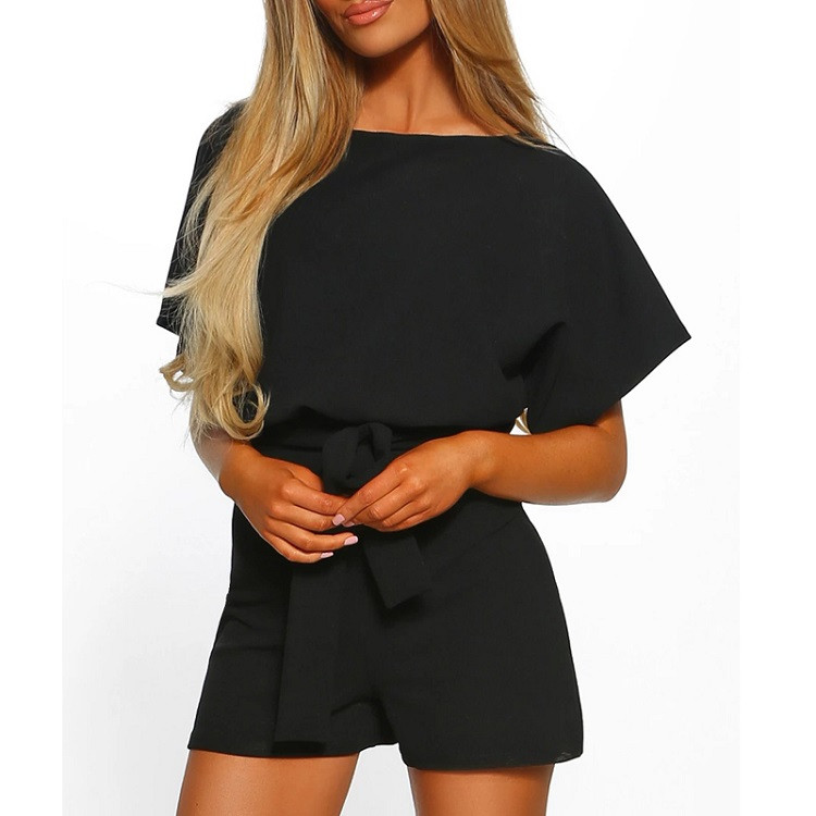 Women's elegant playsuit with short legs and short sleeves. Loose fit with a tie belt at the waist. Available in multiple colours.