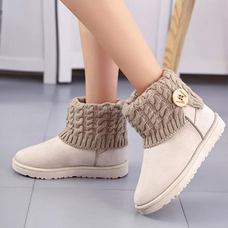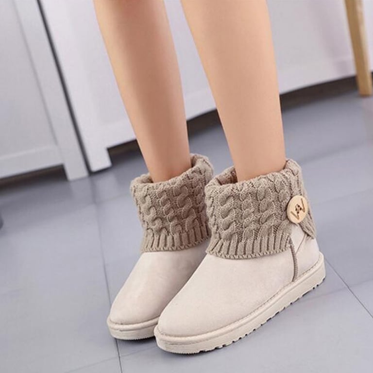Women's low ankle boots with a rubber sole and a knitted cuff, decorated with a large wooden button. Available in several colour options.