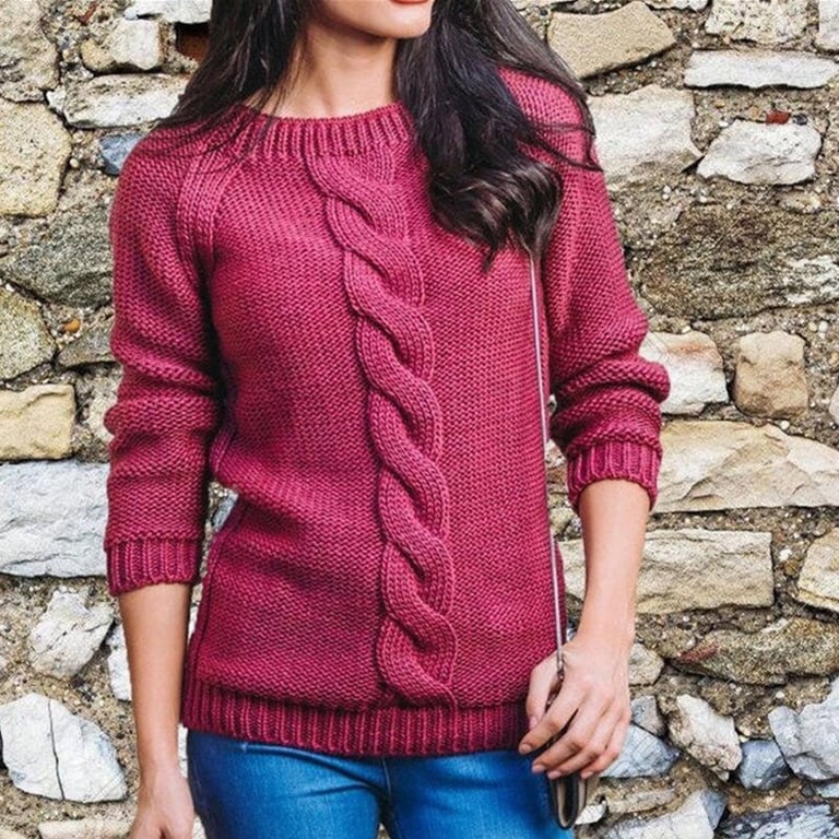 Women's knitted sweater with a cable pattern. The sweater has a fitted cut with long sleeves and a round neckline. It features a drop-shaped neckline at the back. Available in multiple colour options.
