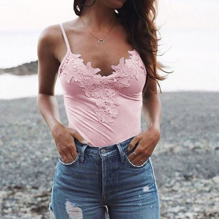 Women's top with spaghetti straps. Fitted cut. Deep neckline adorned with lace. Available in multiple colour options.