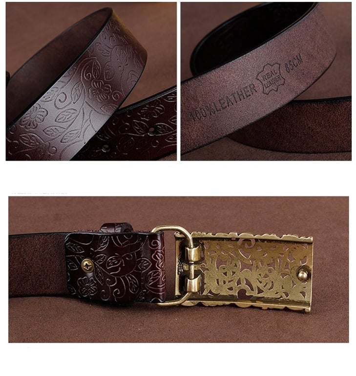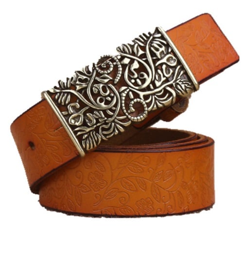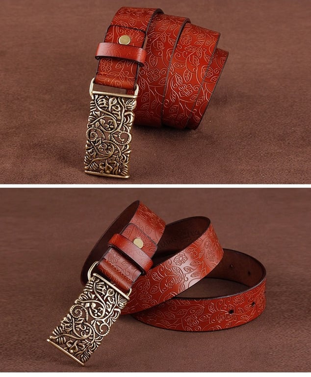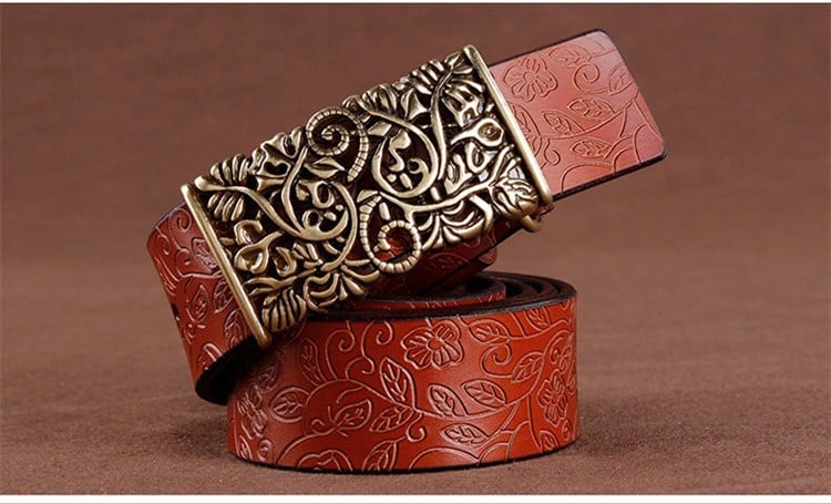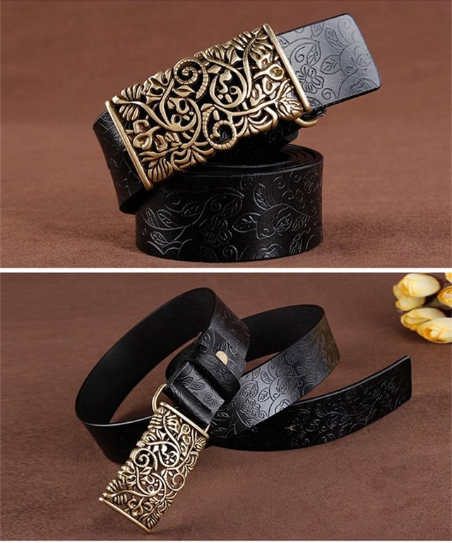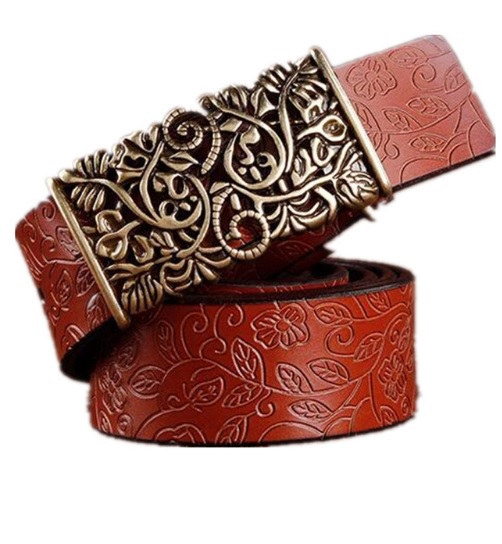Women's leather belt with a decorative buckle suitable for both formal occasions and leisure time.