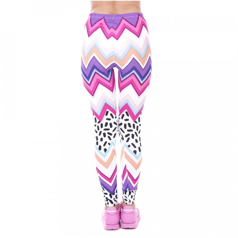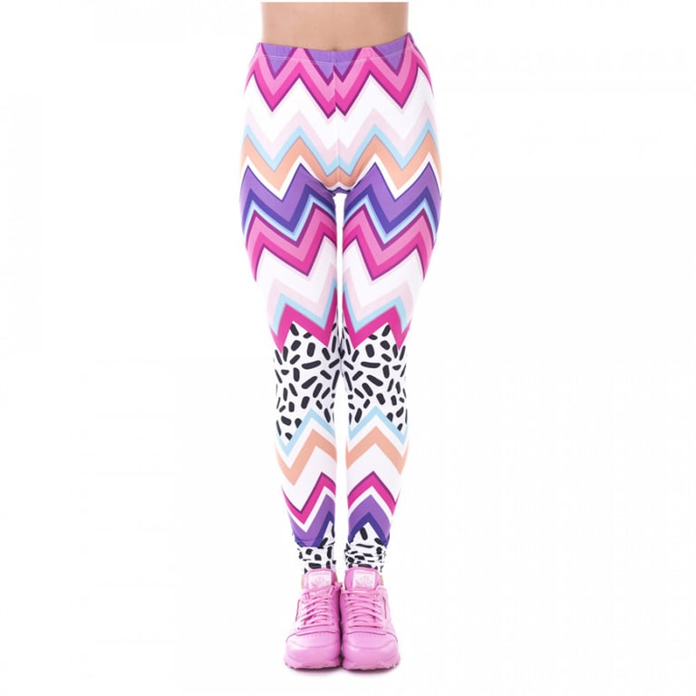 Women's high-waisted leggings. Fitted elastic material. Printed with a colourful pattern.