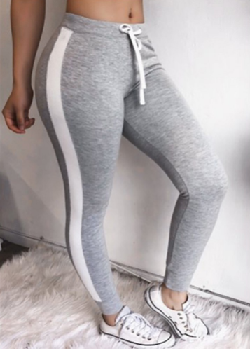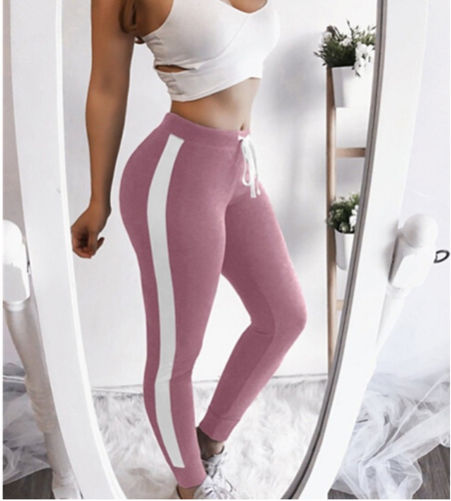 Women's sports leggings with a high waist and adjustable drawstring, ensuring that the leggings do not pinch or press anywhere. The leggings feature a wide white stripe on the side.