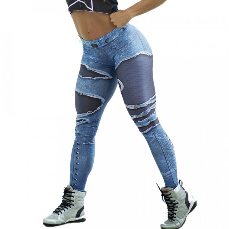 Women's long leggings with an original denim print. Elastic material. High waistband with elastic.