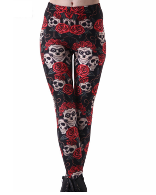 The leggings are adorned with skulls and roses, making them suitable for everyday wear.