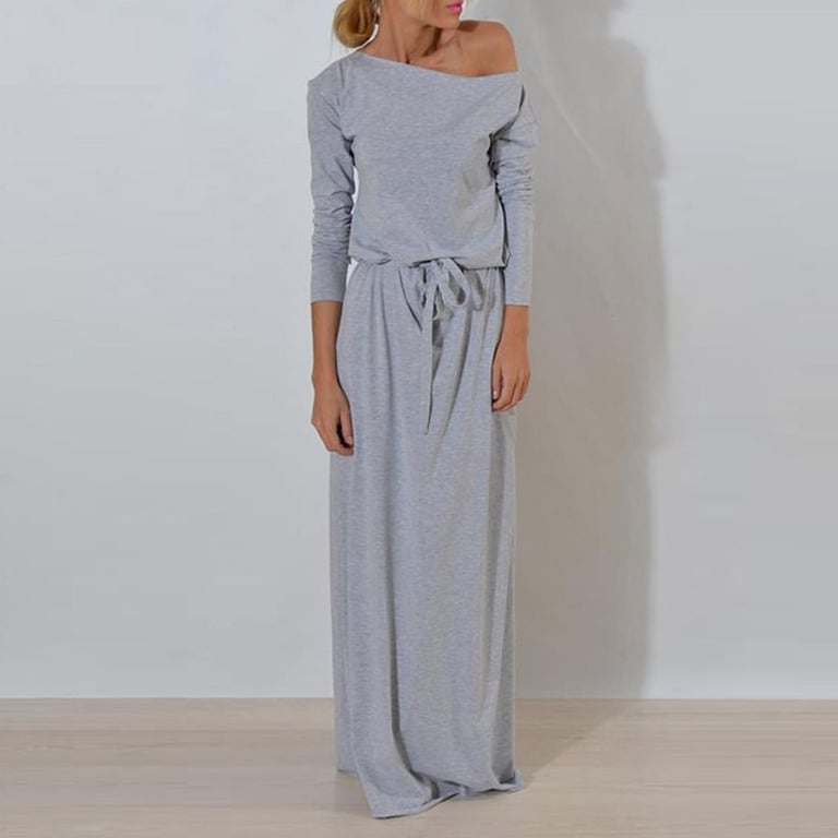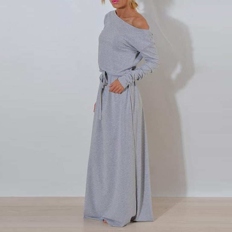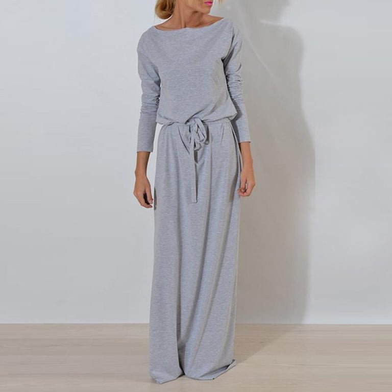 Women's loose-fitting sweatshirt dress with long sleeves. The dress features a round neckline and a drawstring at the waist. Long and comfortable. Available in several colours.