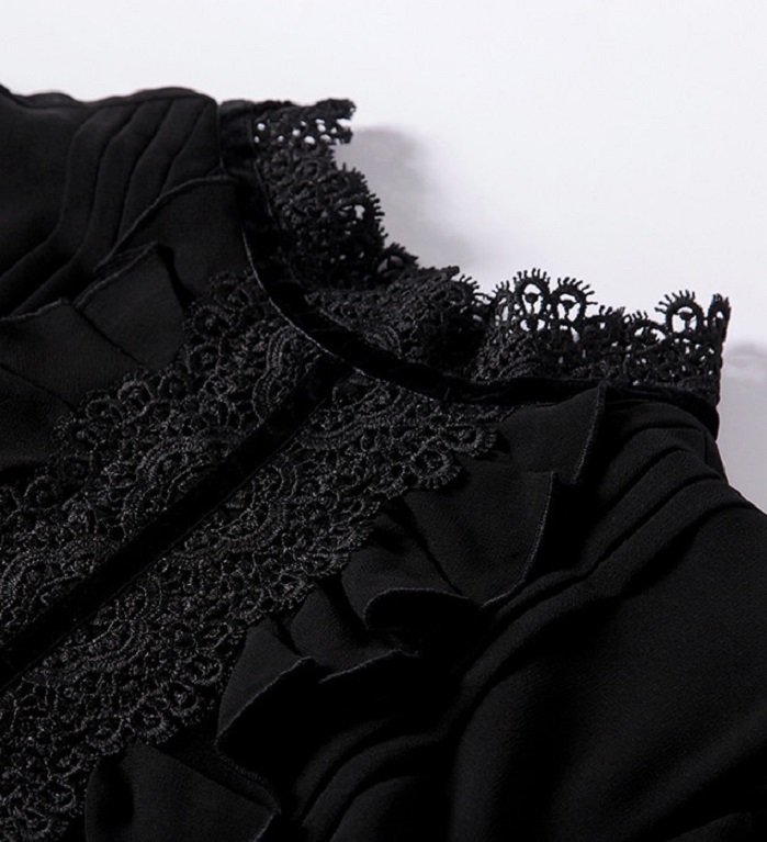 Collar and sleeves adorned with lace.