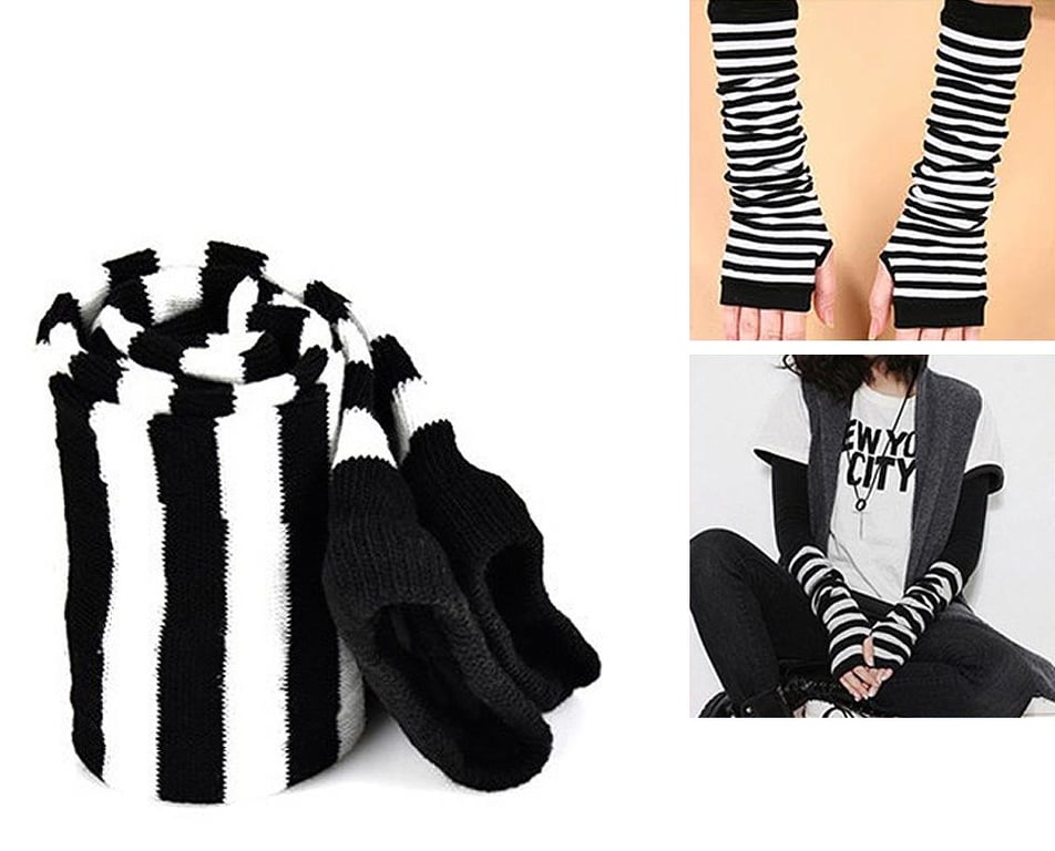Knitted long fingerless gloves.