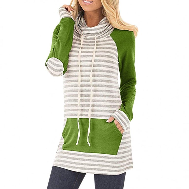 Women's hoodie with a hood and long sleeves. Loose longer fit and kangaroo pocket on the front. Striped pattern. Available in multiple colour options.