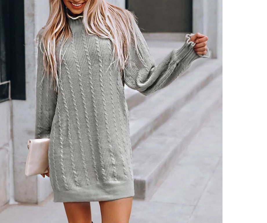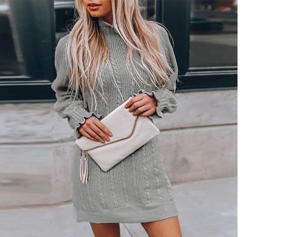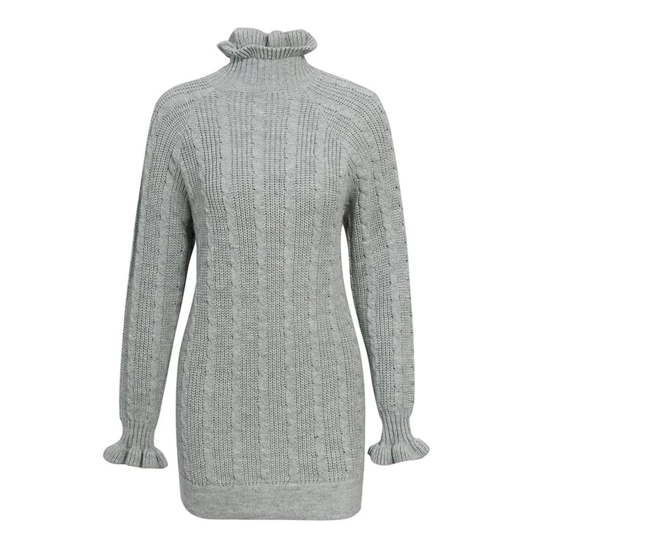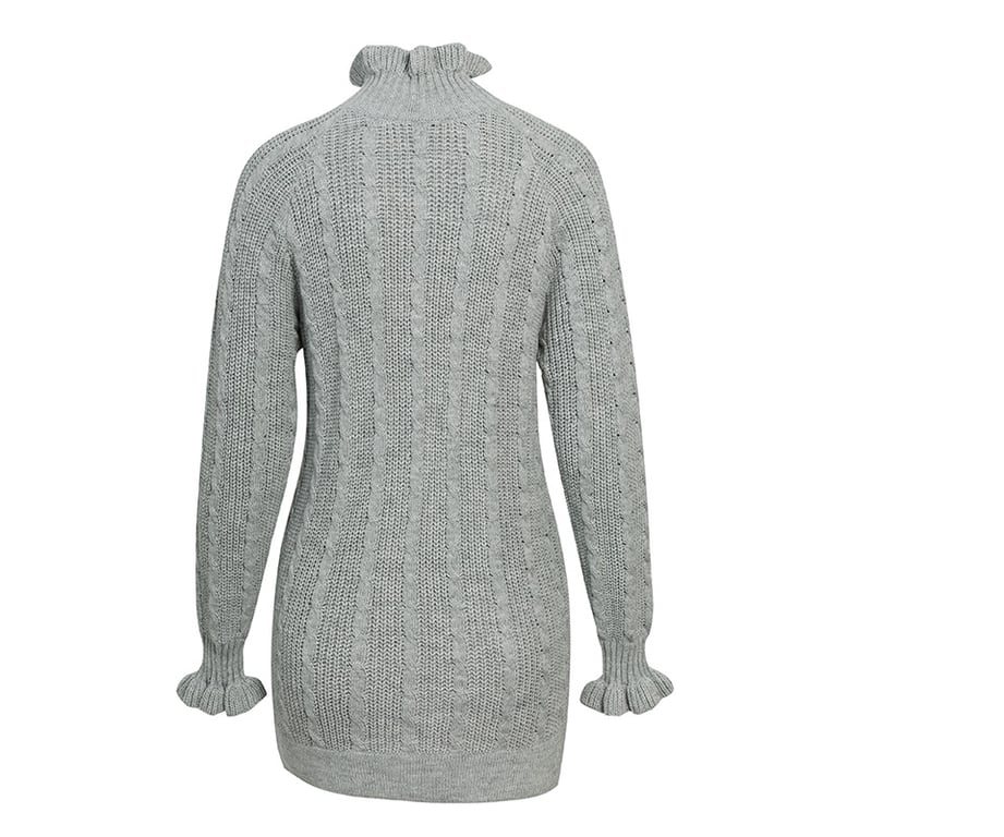 Autumn knitted dress with a turtleneck adorned with ruffles. Fashionable knee-length.