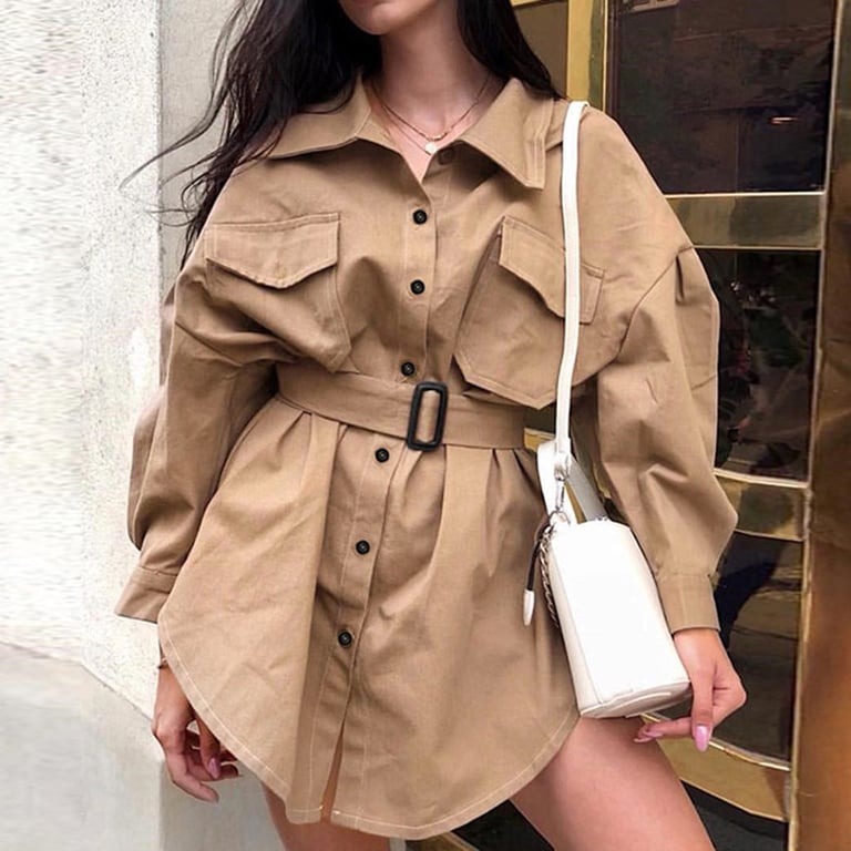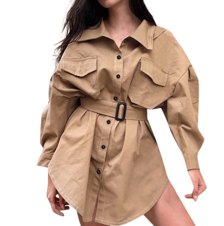 • With long sleeves, button-down front, open collar, and a long belt, with pockets on the chest.