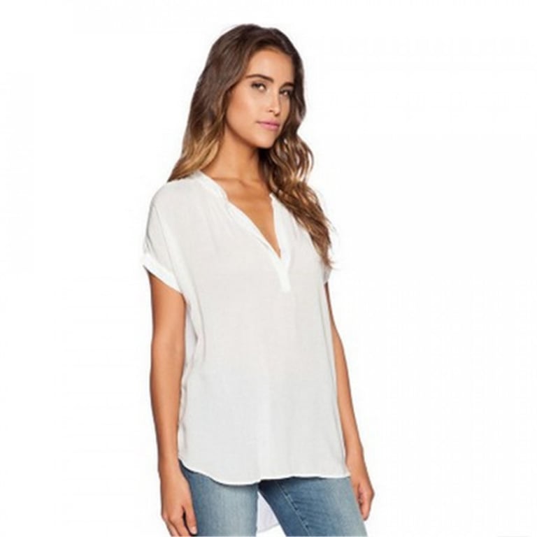 Women's chiffon blouse with short sleeves and a V-neckline with a collar. Loose asymmetric cut. Comfortable lightweight material. Plus size available. Available in multiple colour options.
