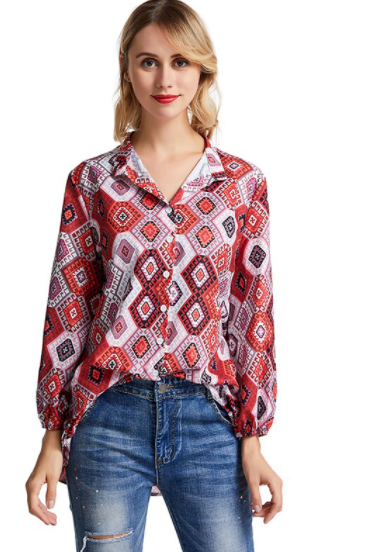 This blouse is available in red. It features a stunning print in European style. It fastens with buttons. The blouse is loose-fitting, making it very comfortable and airy. More suitable for warm days.