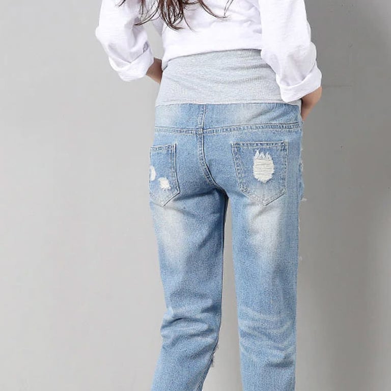 Women's denim maternity trousers. They adapt thanks to the elastic band over the belly. Cropped legs. Distressed finish. Available in dark and light blue.