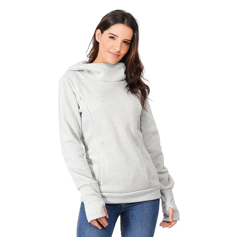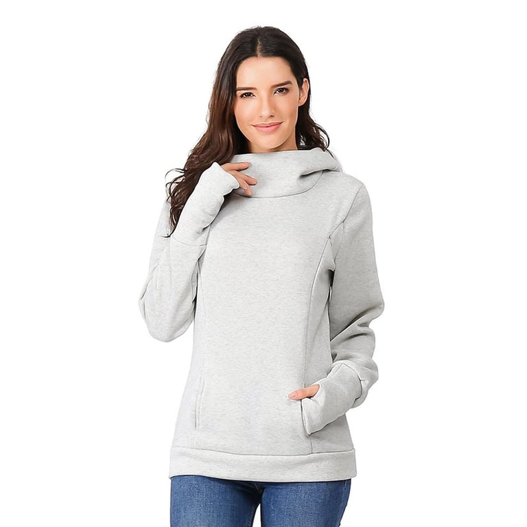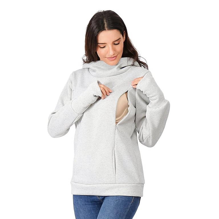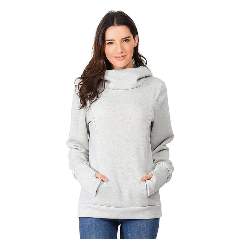 Women's maternity sweatshirt with long sleeves. Loose fit with a hood and collar. Kangaroo pocket. Two zips on the front. Available in multiple colour options.