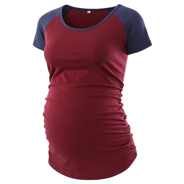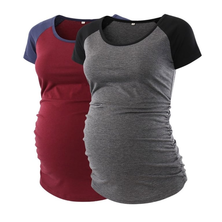 Women's maternity t-shirt with short sleeves. Round neckline, loose fit over the belly, comfortable material. Set of two t-shirts – red and grey.