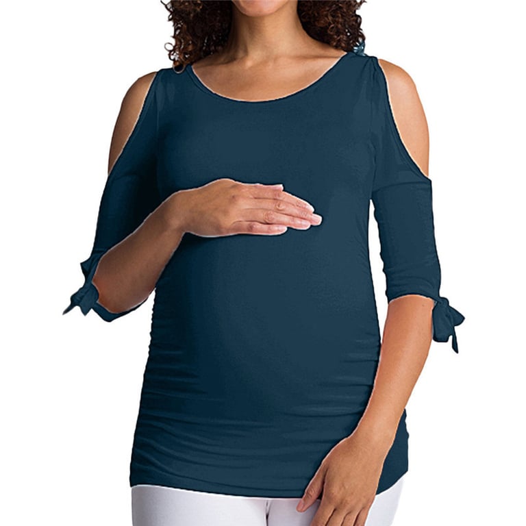 Women's maternity t-shirt with 3/4 sleeves and bows. Off-the-shoulder design. Fitted cut with a round neckline. Available in multiple colour options.