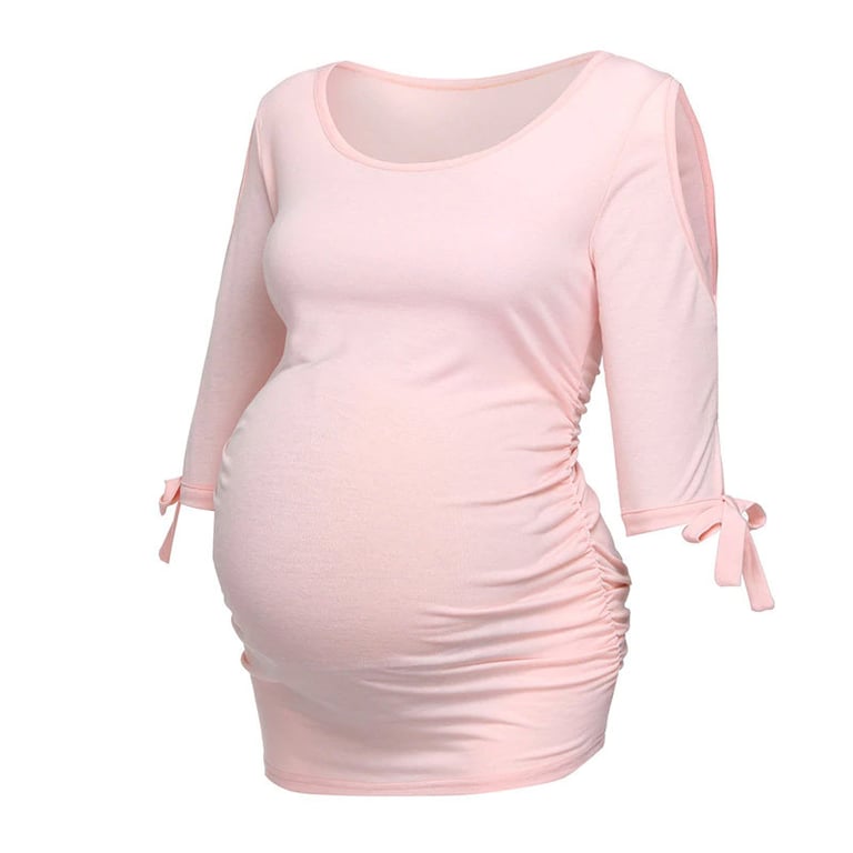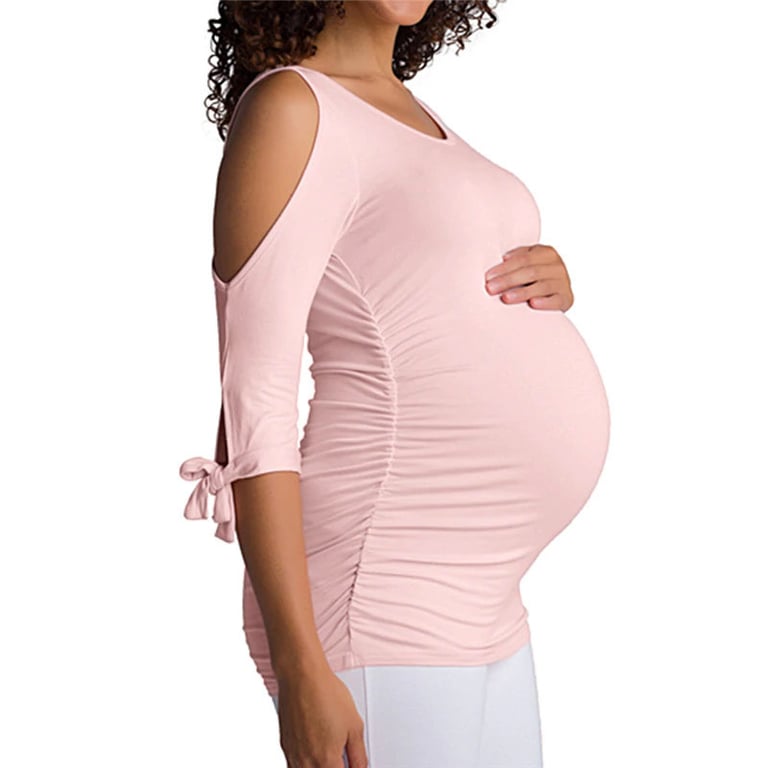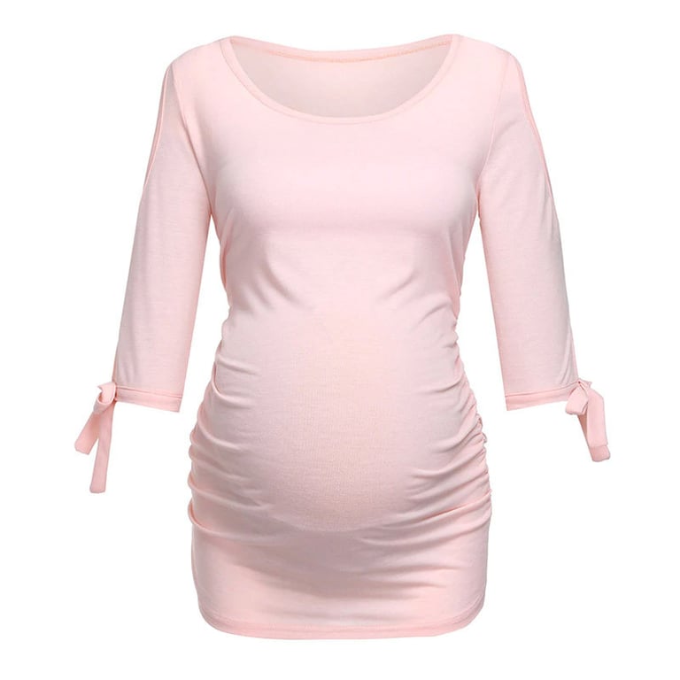 Women's maternity t-shirt with 3/4 sleeves and bows. Off-the-shoulder design. Fitted cut with a round neckline. Available in multiple colour options.